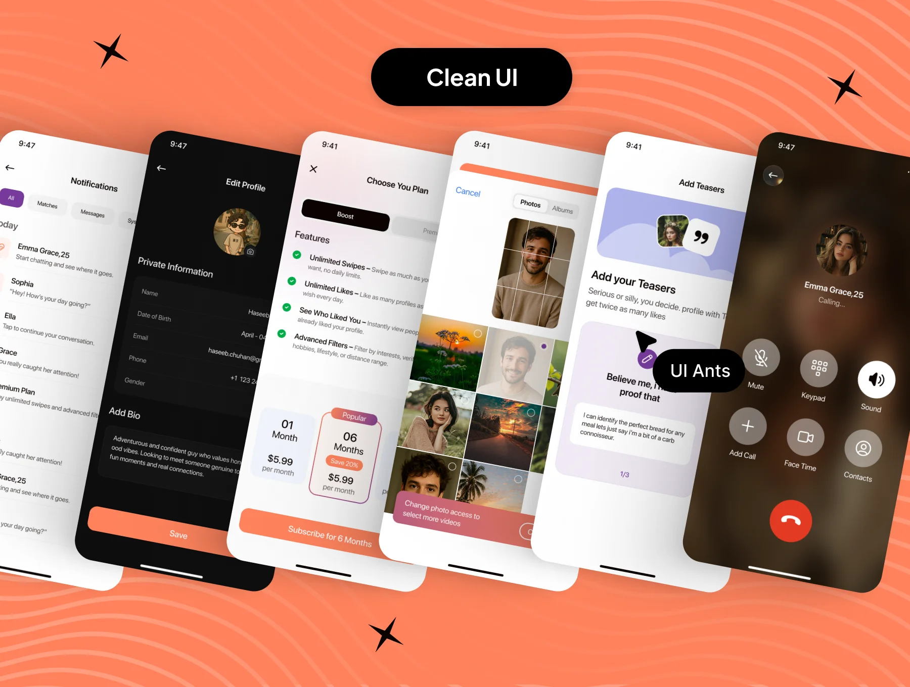 Introducing the Dating App UI Kit – a modern, engaging, and elegant design system created to build meaningful digital connections. With 110+ pixel-perfect screens and 45+ reusable components, this UI kit supports the full dating journey.. from profile setup and compatibility insights to real-time chats, calls, and premium features. Every interaction is crafted to feel smooth, safe, and exciting, helping you deliver a dating experience users trust and enjoy.