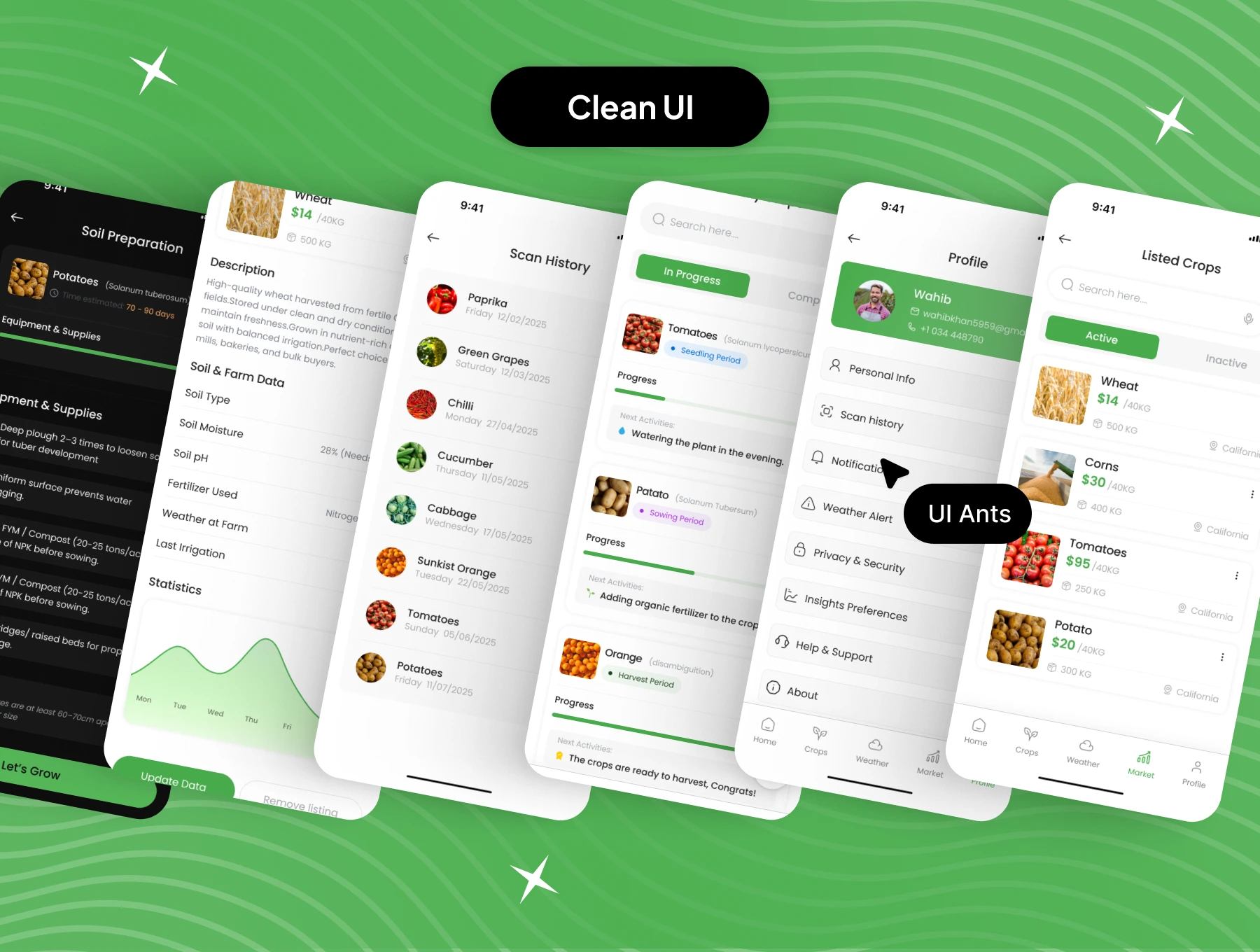 - Dark Mode Included: Home, Crops Progress, Soil Prep, and Market screens