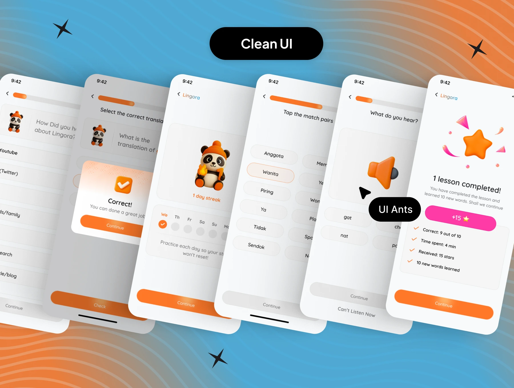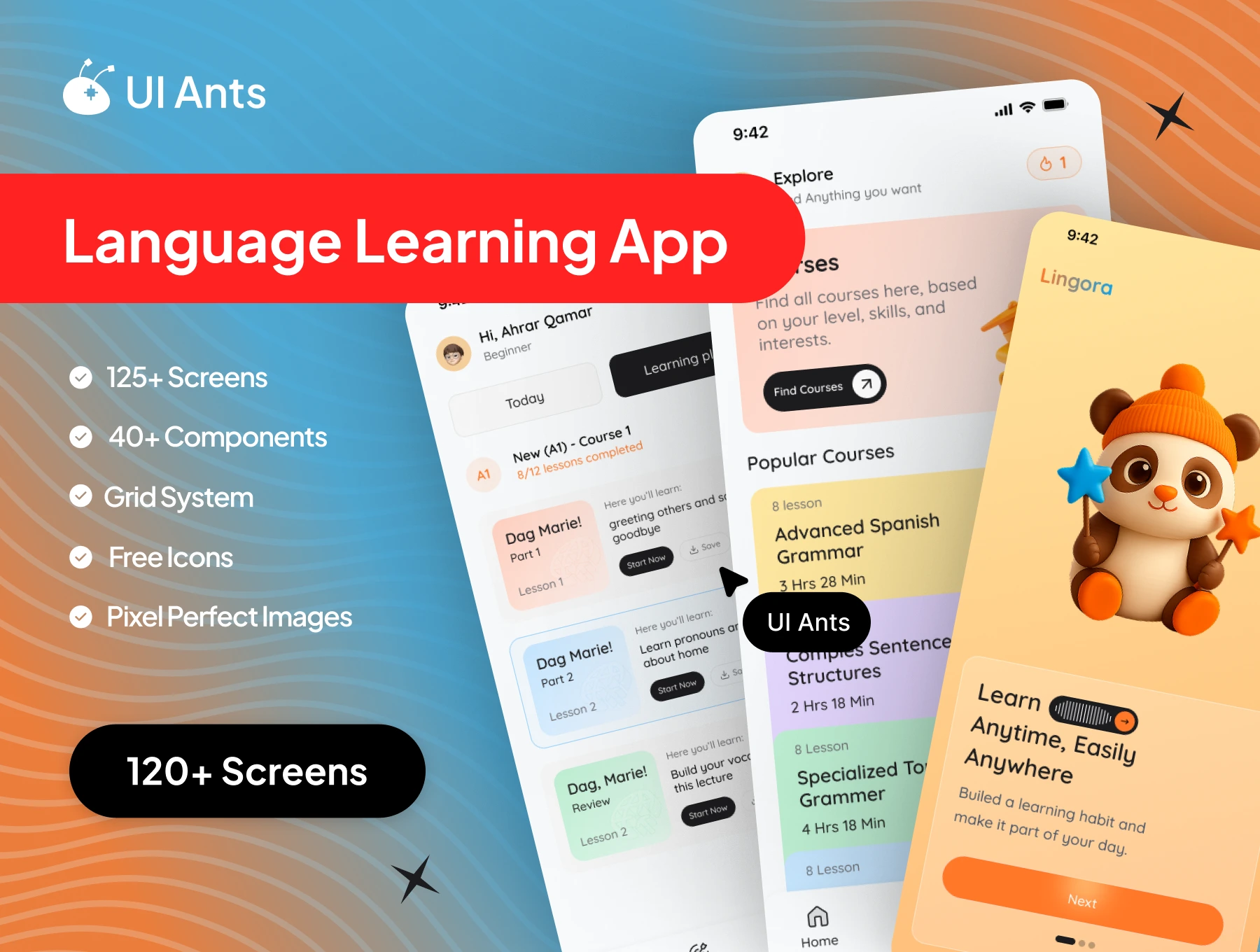 - 125+ high-quality Figma screens covering onboarding, learning, reviews, and profile flows